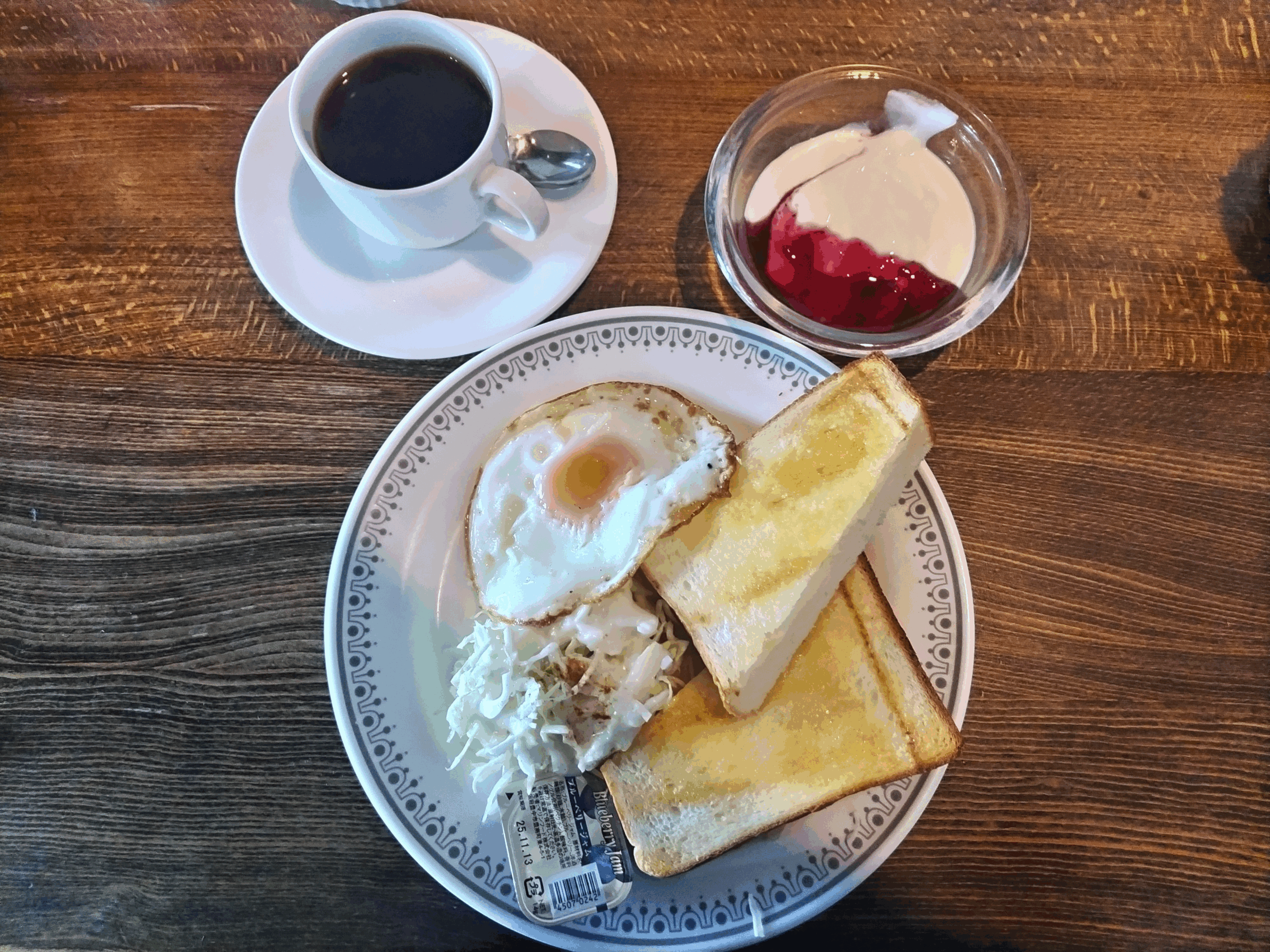 Enjoy a Japanese-style morning set at a cozy lodge-style restaurant. — toast, egg, salad, and coffee or tea