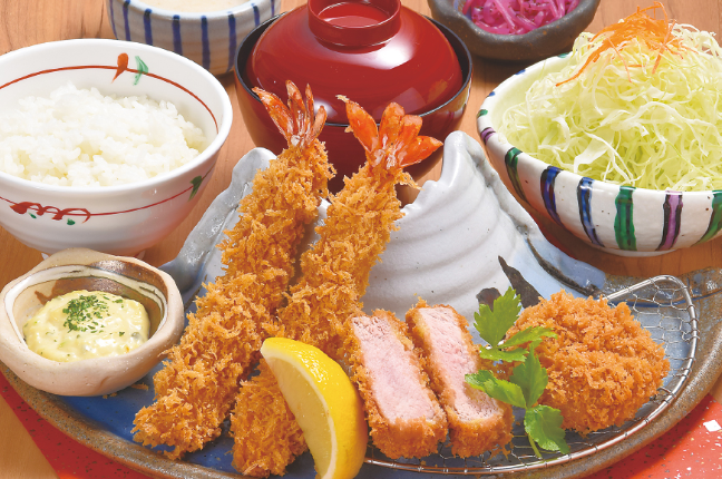 Lunch at Katsumasa Takamatsu — Enjoy a Katsumasa Set Meal featuring crispy fried shrimp and tender pork cutlet (hire-katsu).